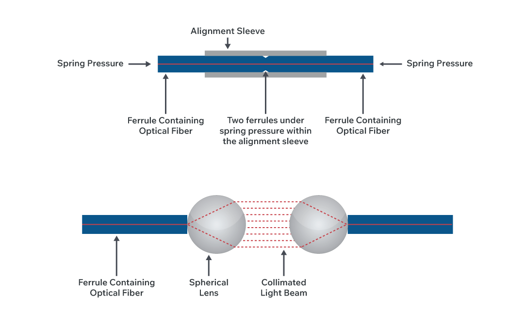 Figure 2. Comparison between physical contact mating (above) and expanded beam components and operation (below).